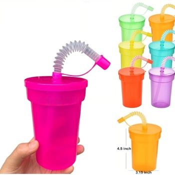Tasses colorées en plastique pour fête d'enfants avec couvercles et pailles Lot de 6 gobelets néon de 12 oz pour fête d'anniversaire